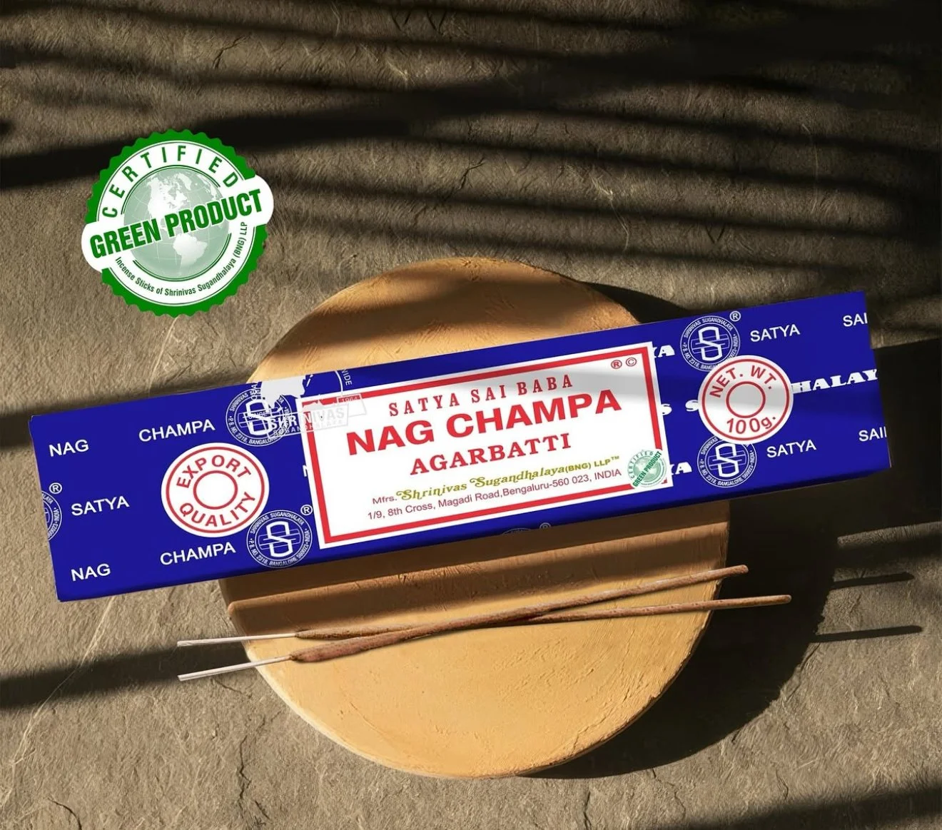 Satya Sai Baba means "Father of Divine Truth" and is the honorific title of a famous Indian guru who has endorsed this incense as his favourite. Nag means "Snake" and "Champa" means flower: thus the name means Snake Flower.